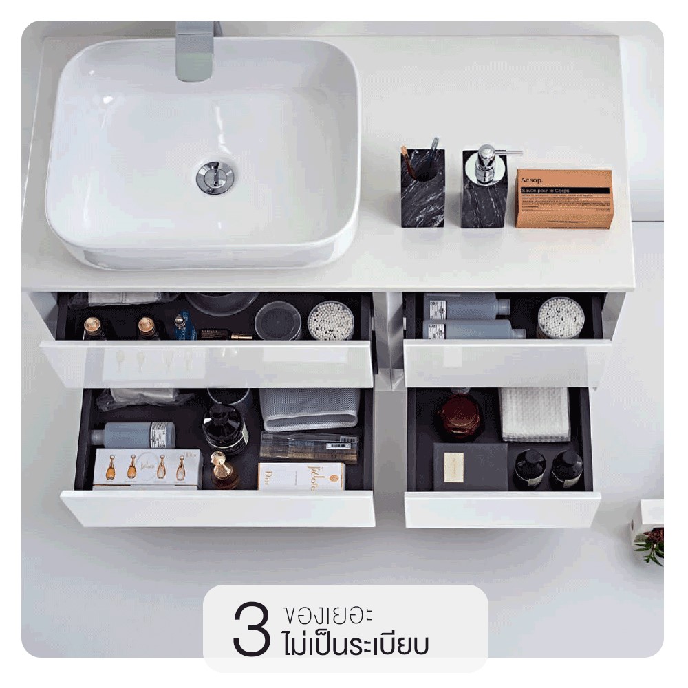 3. ของเยอะ จัดยังไงก็ไม่เป็นระเบียบ ลองหาเฟอร์นิเจอร์ที่ใช้งานสำหรับภายในห้องน้ำโดยเฉพาะ และมีลิ้นชักเพื่อเพิ่มพื้นที่ในการจัดเก็บสิ่งของได้อย่างเป็นระเบียบ ดูสบายตาและสบายใจขึ้นด้วย