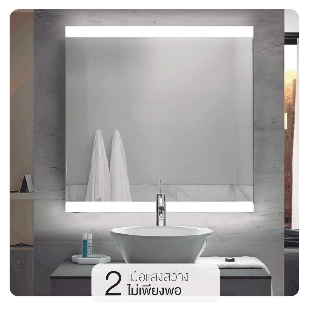 2. เมื่อแสงสว่างภายในห้องน้ำมีไม่เพียงพอ ควรเพิ่มแสงไฟให้มีความสว่างที่เหมาะสม หรืออาจติดตั้งกระจกที่มีไฟรอบกระจก ช่วยกระจายแสงได้ดี ทำให้มองเห็นภาพได้ชัดเจนและเป็นธรรมชาติมากขึ้น