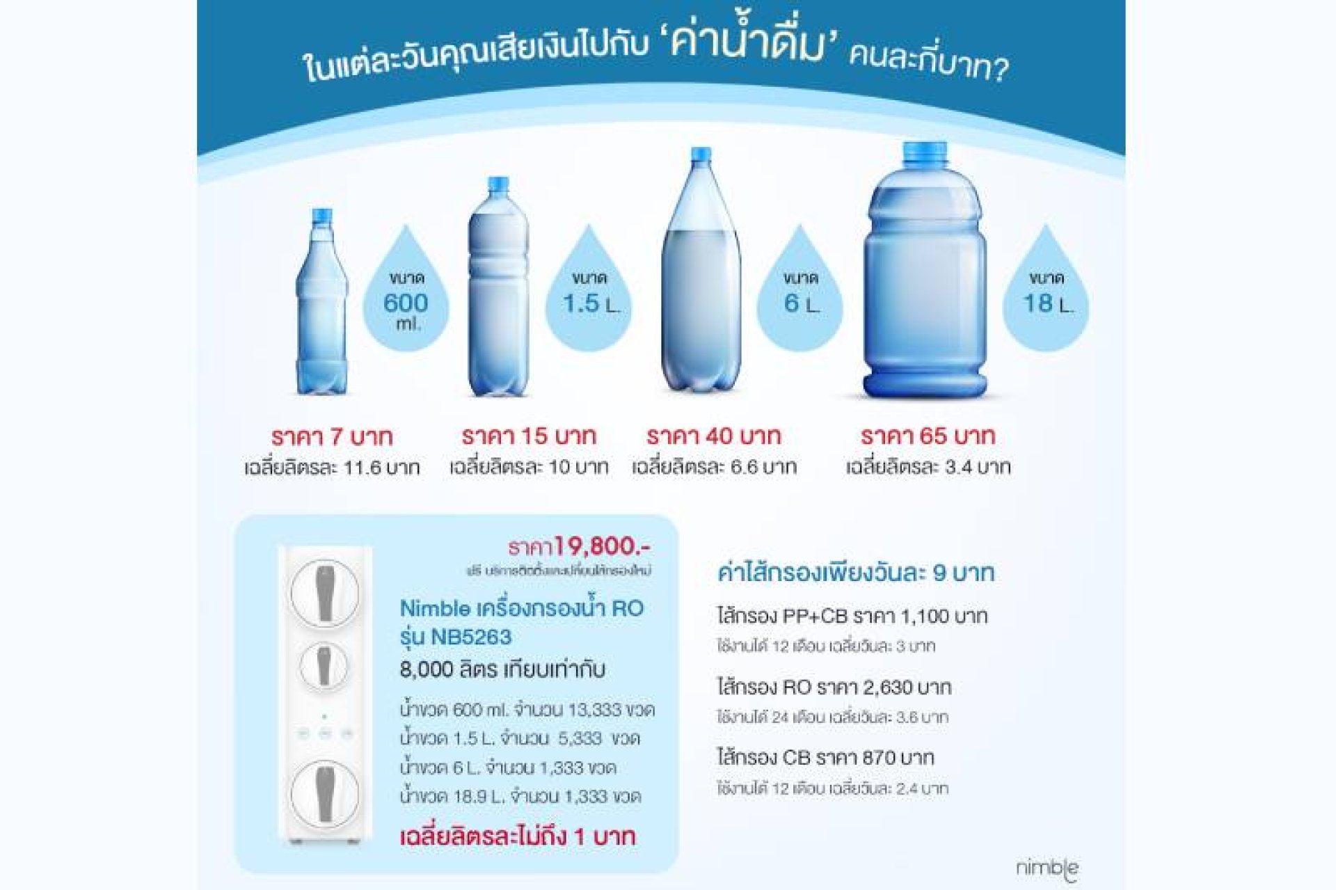 Nimble เครื่องกรองน้ำ PREMIER RO รุ่น NB5263 ราคา 19,800 บาท มีประสิทธิภาพในการกรองน้ำดื่มได้มากถึง 8,000 ลิตร เฉลี่ยลิตรละไม่ถึง1บาท เมื่อเทียบกับราคาน้ำดื่มขวดที่วางขายในท้องตลาด